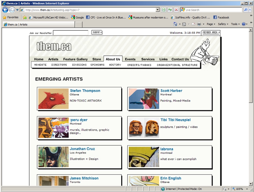 This website is the main hub of activity for them.ca. Founded in 1998, them.ca is/was the largest and longest running organization of street artists in Canada. The archival website linked above was a landmark for the organization in 2003. Including the new design by Natalia Grosner, it also integrated innovative groupware systems developed by James O’Connor. This allowed the organization to de-centralize governance, mentorship, artist sellection and commercial activity. It also introduced new levels of democracy, automation and accountability to the membership. ranging from 3000 to 12 000 visitors a day, it continues to be a pioneer of its type but currently exists in archival format until an overdue redesign is completed.