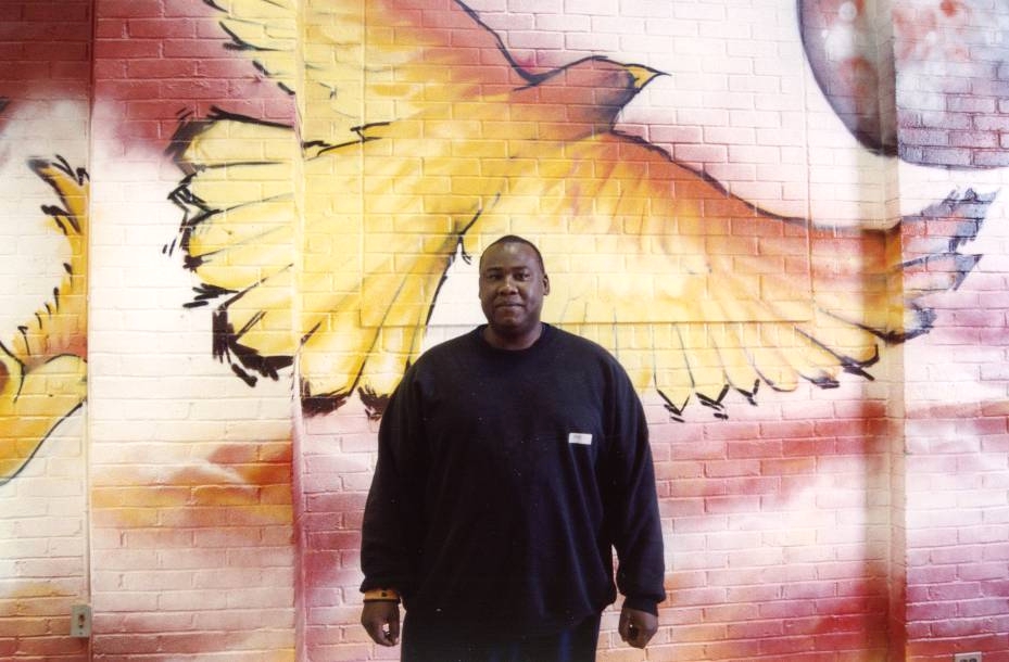 An patient in front of the mural In Kingston Maximum Security Penitentiary