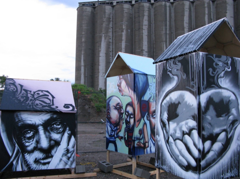 Phase I: The original Housepaint exhibition was installed on the vacant site of the former Tent City in Toronto – where up to two hundred people lived until forcibly evicted in 2002. Over three days in June 2008, through storms, flood, and rainbows, ten of Canada’s top street and graffiti artists each painted a simplified canvas house to commemorate Tent City’s previous residents and homeless people who died on Toronto streets. The Housepaint project, curated by Devon Ostrom, was commissioned by Luminato Toronto Festival of Arts and Creativity in collaboration with Manifesto Community Projects, as part of StreetScape 2008.