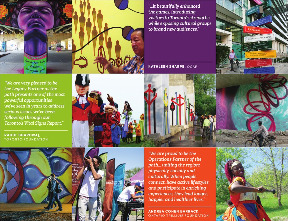 Friends of the Pan Am Path ( Panampath.org ) is a non-profit organization. The vision of the Pan Am Path is to combine the power of arts and sport to create a living trail across Toronto. Friends was established in 2013 with the mandate to:
