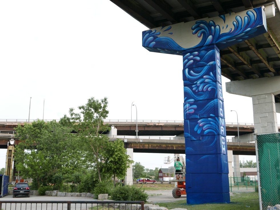 Part of a Love Letter to the Great Lakes, nine artists painted the pillars below the DVP / Gardiner Ramps at the mouth of the Don River and at the Rail Bridge at Don Landing. The river-side murals are inspired by the resilience of the Don River and explore the ecological challenges and opportunities faced in renewing our relationship to this urban watershed. Produced in collaboration with SurfaceArt.