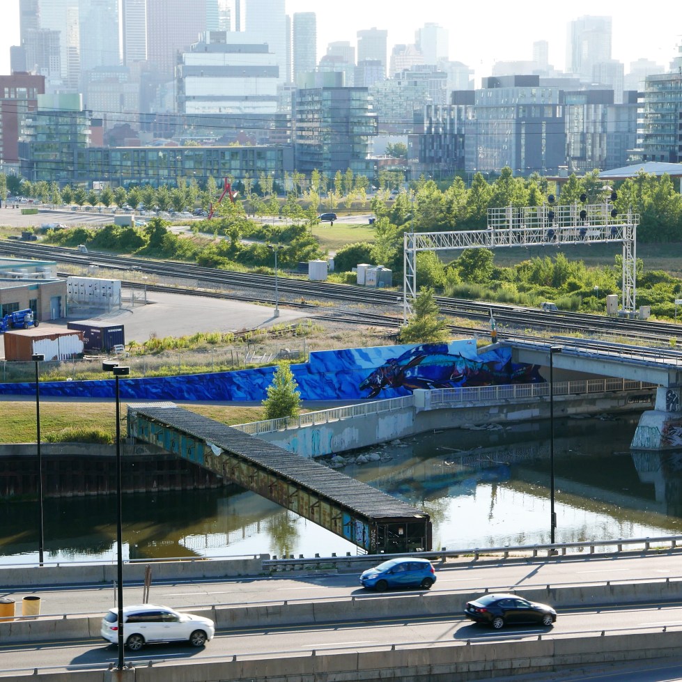Part of a Love Letter to the Great Lakes, nine artists painted the pillars below the DVP / Gardiner Ramps at the mouth of the Don River and at the Rail Bridge at Don Landing. The river-side murals are inspired by the resilience of the Don River and explore the ecological challenges and opportunities faced in renewing our relationship to this urban watershed. Produced in collaboration with SurfaceArt.